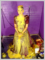 Needless to say, after letting her put a drop a few slices of gateaux into her lovely dress, we rigged the questions. :-) The dress gets totally coated in gunge, inside and out, and Veronica even pours cupfuls of custard over her head, including total face coverage at one point.