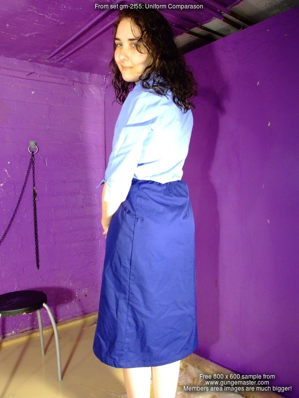 Fair is fair, so Rose now submits to Veronica, and is given a nice messy gateaux, topped off with syrup, to sit in herself. So much for her smart blue uniform skirt - squelch! - and she also has a nice sticky bum. Rose remains seated while Veronica pours more syrup all over the front of Rose's skirt till it pours off the hem and all over her black plimsoles.