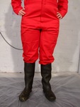 With a genuine passion for uniforms and industrial clothing, as well as being an enthusiastic gunge fan, this was a genuine evening's play for Wendy, the cameras being almost incidental. First she prepares a tray of gunge, with gateaux and custard, and sits down in it, then she mashes several trifles into her lap, before filling her suit with several cartons of custard. Pockets are filled, and more and more gunge poured on, until eventually she takes to the floor and rolls around in the spilled mess she's created.