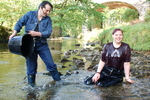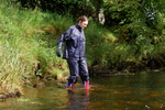 and soon has her trouser bottoms wet. Evelyne's dryness doesn't