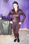 a sleeveless PVC catsuit and New Rock boots. She starts