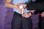 But fair is fair so now it's Maude's turn and she doesn't resist as Charity empties several cups of gunge down inside the fronr of Maude's jeans, rapidly soaking them in gloop from inside.