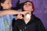 Turn by turn they gradually reduce each other to messy ruin, with custard poured inside underwear, down inside their skirts, filling their boots, inside their shirts, slathered all over the outside of their outfits, sitting in custard filled trays, and finally giving each other very thorough custard shampoos all through their beautiful free flowing long hair.