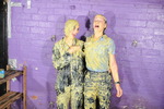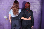 They've deliberately dressed for their impending messing, in sportswear that will really show the effects as the gloop is poured on and in, but still look good clean, and great messy! Lady Jennifer wears an entirely matching full tracksuit in turquoise with pink details and a purple hood, which exactly matches her purple hair. She wears black and white trainers. Honeysuckle wears red tracksuit trousers with a black tracksuit jacket, and black converse-style basketball boots. They both wear swimsuits under their tracksuits, and know they'll be having those filled, soon enough!
