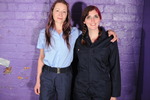 After a day on the mudbanks, the girls hose each other down in boilersuits