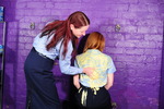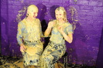 Turn by turn they gradually reduce each other to messy ruin, with custard poured inside underwear, down inside their skirts, filling their boots, inside their shirts, slathered all over the outside of their outfits, sitting in custard filled trays, and finally giving each other very thorough custard shampoos all through their beautiful free flowing long hair.