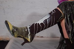 Her ladyship utterly drenches her dress in cream, then custard. She pours custard and syrup onto her chair, and takes great delight in sitting in it, squelching the mess into her bottom. She pours cream all down her front, laughing as it goes through the mesh of her skirt to drench the underskirt beneath. Cream and custard flow over and into her PVC bodice and over her skin. Her beautiful, and brand new, calf-high boots don't escape either - she fills them both, one with custard, one with suryp, and totally coats them on the outside too.