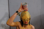 Once her outfit has been entirely reduced to messy ruin, she sets about her hair, a full syrup shampoo is among her pleasures, followed by a full custard facial, including custard flowing inside her glasses.