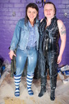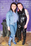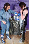 Lucinda, in jeans, blue and white check shirt, and faded denim jacket, and Evelyne, in her favourite PVC catsuit, totally drench each other from head to toe with milk.