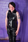 Evelyne is dressed for a messing in her favourite sleeveless PVC catsuit and thigh-high, chrome-heeled kinky boots, she's in for a totally messing up and really looking forward to it. Lady A, who will be delivering the messing, is dressed for the dungeon herself, in pleather shorts over fishnet tights, fancy t-shirt and 14 hole Doc Marten boots, though she'll be staying clean for now.