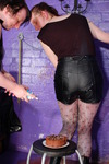 Shorts filling comes first, and those lovely shorts are soon being filled, first with cola, then with milk, which floods in and then leaks down her legs, soaking her tights and collecting in her boots. Of course being effectively waterproof all the goo inside her shorts doesn't really show on the outside, so next up Evelyne has her sit on some nice gooey squishy cake, which really messes up the backside of her shorts. And then custard is poured into the already wet interior just to ensure she really feels the mess.