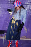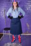 Originally shot back in 2012, Chastity is dressed in a uniform to celebrate the Queen's Diamond Jubilee - our standard knee-length navy blue skirt and pale blue blouse combination, but with Union Jack wellies and a Union Jack hat!