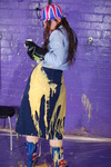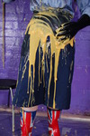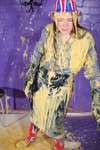 She covers herself in custard and milk, including filling her wellies with milk, and filling the hat with custard before putting it back on her head.