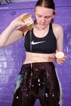 Her leggings get totally drenched in mess, with the results flowing down her very shapely legs and all over her shoes, then she sets about her bra top too, drenching and covering that in mess, before finally also pouring mess all over and through her lovely long hair.