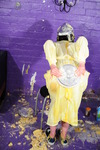 Once her dress is totally messy, she takes it off to reveal the swimsuit she's wearing beneath it - which she then fills and totally coveres in goo, too.