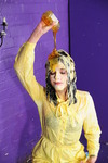 She fills her shoes with custard and syrup, then puts them back on. She pies herself in the face multiple times, and sits on a pie too. She covers her hair and face with syrup, and totally drenches her dress in mess.