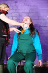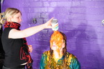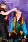 Now soaking wet in bean sauce and soup from the waist down, Lady Amaranth sits back down to have the remaining clean areas of her outfit drenched in sauce, her hair shampooed with soup and spaghetti, and finally baked beans poured down over her face to finish off the mess.