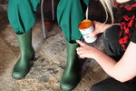 Then, while she's still sitting in the large pool of mess in her overalls, Lady-A has her left welly filled to the brim with soup, while her right one is removed, filled with chopped spaghetti, and she's made to put her foot back into it, squidging spaghetti and sauce everywhere before neatly tucking her overalls trouser leg back into the mess - it wouldn't do to have her trousers untucked, even if they are completely flooded with sauce.