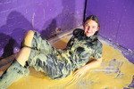 Having done her front she turns and does her back, pouring lots of custard down over her long hair, covering it as well as her shirt and trousers. Milk is added to custard, lots of cartons, and it floods over her face as well as her shirt and trousers.