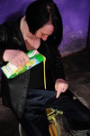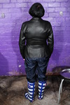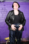 The only real rule here at Saturation Hall is that everyone should enjoy their gunge. And so here we have Evelyne the Cook, who's a bit older than most of our people but who really loves to get messy, dressed for the occasion in dark blue waterproof trousers, black spandex swimsuit, and a rather curious rubberised jacket she's particularly fond of, plus wellies of course - and she's not staying clean for long!