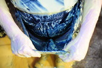 Custard sitting comes first, as Evelyne carefully lowers her nylon-clad bottom into an inch-deep tray of sloppy yellow custard, squelch! This makes a beautiful mess of the seat of her trousers, but of course being waterproofs the mess is only on the outside. That will never do for one of our people, so having stood up to show off her messy botom, she sits back down in the custard, facing forwards - and she happily pours two full kilo cartons of lovely yellow gloop down inside her trousers, where it collects in a pool around her lower trunk and upper legs, soaking into her swimsuit and wetting her nicely inside the clothes. And then she stands up again, sending a wave of custard down inside the clean legs of the trousers and into her boots.