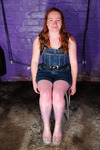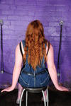 She's simply dressed, wearing a black swimsuit under baggy blue denim short dungarees, belted in tight at her waist, and with a pair of see-through wellies on her feet, and her long red hair flowing free down her back.