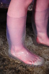First she poses, showing of every aspect of her cute outfit, both standing up and sitting down, so we can see just exactly what she will be messing up. Then, she slips her feet, one at a time, out of the clear wellies, pours in a good quantity of custard, and then slips her feet back into them, painted toenails and dainty feet sliding into the thick yellow gloop, which we can see perfectly through the transparent boots. Once each foot is in and wearing a custard sock, she slips it back out to show off the custard-coated state, then slips them back into the boots. She spends the rest of the scene wearing the custard filled boots.