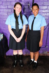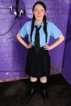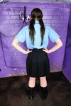Both girls wear identical uniforms of dark blue skirts, pale blue shirts, and black ties, but Friday is little miss prim and proper, with her shirt correctly buttoned all the way up and her tie neatly done and with its tip tucked into her skirt, while Chastity is little miss scruffy, top button undone, tie lose, and wearing wellies instead of proper shoes. Not that the different approaches make any difference to the result, as both girls end up utterly drenched in mess from head to toe!