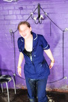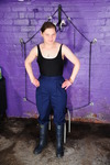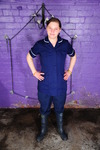 Nurse Wendy is dressed for messy action, wearing her dark blue uniform tunic and trousers over a black swimsuit, and with blue wellington boots worn over black socks on her feet. She's definitely getting messy today!