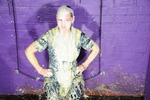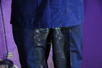 Then she puts her clean uniform back on over her filled swimsuit and custard-coated legs, trousers first, pulled up and neatly buttoned and zipped, wellies back on, and then her tunic slipped over her head and zipped neatly up. Now she's once again all neatly uniformed - except that the inner thighs of her trousers are rapidly darkening as the wetness of the custard soaks through them from inside. She lets us enjoy her steadily wetting trousers for a moment, and then grabs more custard, unzips her tunic a little, and starts filling her swimsuit again. She keeps going until custard is not only leaking through her trousers from inside but also flowing out from under her tunic and down the outside too. Then she starts pouring more custard just into her tunic, front and back, before eventually just pouring custard all over the outside of her outfit too.