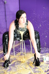 Eventually we reminded her of the original plan, and so, now completely drenched in goo, she stands up and slips the clean pleather dungarees on, after dropping an extra carton of custard into her swimsuit to flow out inside the overalls as she pulls them up and clips the straps neatly into place.