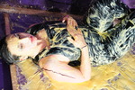 This set didn't quite go to plan. What Veronica was meant to do was quickly pour a carton of cream, and one of custard, down the front and back of her swimsuit, and then pull on her brand new, Marks & Spencer pleather dungarees, and enjoy the feelings as the cream and custard leaked out of the swimsuit and flowed down inside the clean pleather.