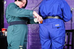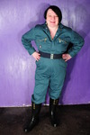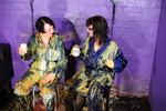 Dressed for mess in boilersuits and boots, Evelyne the Cook and Miss Pink test out a new messy game for Hall visitors to play. The game is simple, one person chooses a substance from the variety on the table, the other person then selects an area where it will be poured. They then play scissors-paper-stone and the winner gets to pour the mess on the looser in the pre-chosen location.