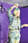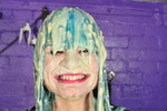 Turquoise-haired Daisy covers her denim outfit with custard and cream