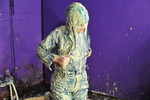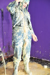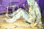 She prepares and sits in a tray of mixed custard and cream, then puts her jacket back on and starts pouring custard down her front, all over her t-shirt and down her jeans and messing her jacket up too.