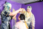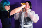 Something a little bit different: Evelyne the Cook, and Virginia, are both dressed in see-through OMP plastic jumpsuits, worn over simple black trousers and tops, and with wellies on their feet, while Daisy is in a dark blue nurses uniform dress, with matching dark blue wellies. Daisy is going to fill the other two's suits with mixed sweet mess - syrup, custard, and Devon Dream - and we'll get to watch the gloop flowing down inside the see-through suits while enjoying the gasps and reactions as the cold gloop slithers down.