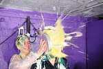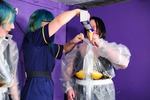 The suits have quite tight elasticated waistbands, so initially the mess gathers at the two willing victims' waists - but then the waistbands are pulled out, and down it all floods!