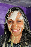 They continue together, steadily reducing each other to mess-drenched ruin as they cover and fill each other's outfits with cream and custard, neither resisting at all as they completely destroy each other. At times they revert to turn-based messing, when they cover each other's backs and bottoms for example, and later on in the scene they break out some custard flans and pie each other, Friday taking two in the face while Teena takes a custard pie sandwich.