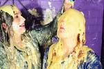 By the end of the session both girls are completely drenched in mess, the scene includes clothes filling, pouring mess on the outside and spreading and massaging it in by hand, full messy shampoos for both girls, and messy faces too. At the end, completely drenched in custard, they empty large bottles of fizzy cola down each others' outfits too.