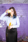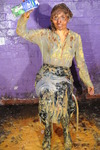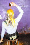 And from there, Maude does a very thorough and detailed mess test on her entire outfit. She treats the still-clean back of her skirt to a spectacular cake-sitting, she gives herself a very thorough messy shampoo, with the drips flooding off her head and flowing down over her blouse, she does some blouse filling both via the neckline and pouring mess into her sleeves, and by the end of the test she had reduced her outfit and herself to a wet and slippery mess, from head to toes. She lifts the skirt to show the very messy state of her tights too.