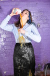 Next, how will that beautiful long satin finish penil skirt handle the mess? Several cans of soup get poured in down the front, flowing inside the skirt and covering Maude's tights, visible through the skirt's long slit. Custard follows, just to really ramp up the test.