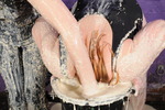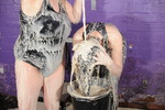 Penny Banks, dressed in a brand new black one-peice swimsuit and wellies, and Honeysuckle, wearing running tights and a running top, with no underwear, and wellies, spend a merry afternoon in the dungeon filling each other's clothes with porridge!