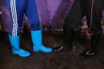 Honeysuckle wears a beautiful classic royal blue Adidas track suit, over a turquoise swimsuit, and with wellies that match her swimsuit. Maude wears a sleeveless Nike sports catsuit over a black swimsuit, with sparkly wellies.