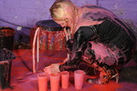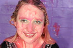 She wears a skin tight black spandex catsuit, with a black studded mini-dress over it, and the boots. She starts with dress filling, and then during the course of her gunging she sits in trays of gunge, covers her dress and catsuit in it, gives careful and detailed treatment to her boots, and finally drenches her long blonde hair in it too.