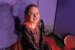 Felicity, dressed in black with silver studs and wearing spectacular high heeled New Rock boots, gets totally covered in red and purple slime!