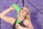 There's a rule here that all swimwear must be carefully tested in the dungeon before being used anywhere else, or indeed swum in, and so here we see blonde Felicity, wearing a brand new "boyley" swimsuit, about to give herself a very thorough filling with green gunge! She also wears jelly sandals, and those get the treatment too.
