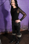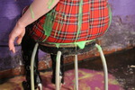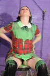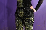Beautifully dressed in black shiny satin-finish lace-side jeans, black mesh see-through top over a black swimsuit, and wonderful calf-high black rubber / suede boots with fluffy tops, Honeysuckle sits down on a chair in the dungeon and starts to recite Pi. At which point Rosemary, in red check mini-dress and knee-high black stockings, plants a nice squishy pie in Honeysuckle's face. This is repeated several times, with more and more pie residue dripping and flowing down to collect in Honeysuckle's lap. Those pristine satin jeans are soon getting rather messy!