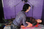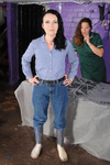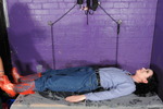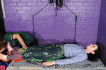 Honeysuckle wears blue jeans, blue and white checked shirt, and clear wellies, while Maria wears a green knee-length nurses uniform dress, with black wellies. Maria stays clean while she totally covers Honeysuckle, then they change places and the gunge-drenched poet gives the nurse the total messy treatment too. Both girls end up totally drenched in multi-coloured gunge from head to toe.
