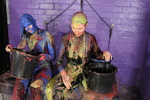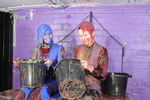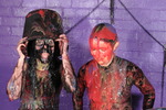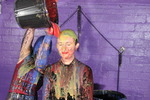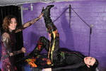 As well as liberally filling each other's clothes with gunge, the two women lie each other down on the table for full buckets of gunge poured on. Maude's bright pink outfit gets totally drenched in black and blue gunge, Honeysuckle's smart black clothes and boots get drenched in red and yellow gunge. Initially they completely wreck each other's clothes and boots, Maude having her entire outfit drenched by still-clean Honeysuckle before the tables are turned, then Honeysuckle's entire outfit is drenched, and then together, covered in goo from the neck down, they set about each other's heads and hair with even more gunge.