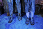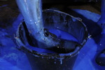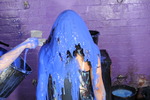 Their hair doesn't escape the treatment, they empty buckets over each other, totally drenching hair and faces in blue. They also stand in buckets of gunge to make sure their canvas boots are totally drenched too.